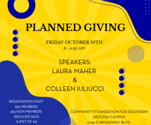 Planned giving is a way to deepen relationships with donors and strengthen the long-term sustainability of your mission, yet it can also feel overwhelming to launch or manage without a clear strategy. Join Colleen Iuliucci, Regional Director at the Arizona Community Foundation, and Laura Maher, Vice President for Philanthropy at the Community Foundation for Southern Arizona, for an informative, collaborative session focused on tips and tricks to integrate planned giving into your organization’s fundraising strategy. We’ll discuss practical steps to build or enhance your planned giving program, explore common giving vehicles, and share additional resources. Expect a robust conversation and actionable tools, and please bring your own questions and ideas.