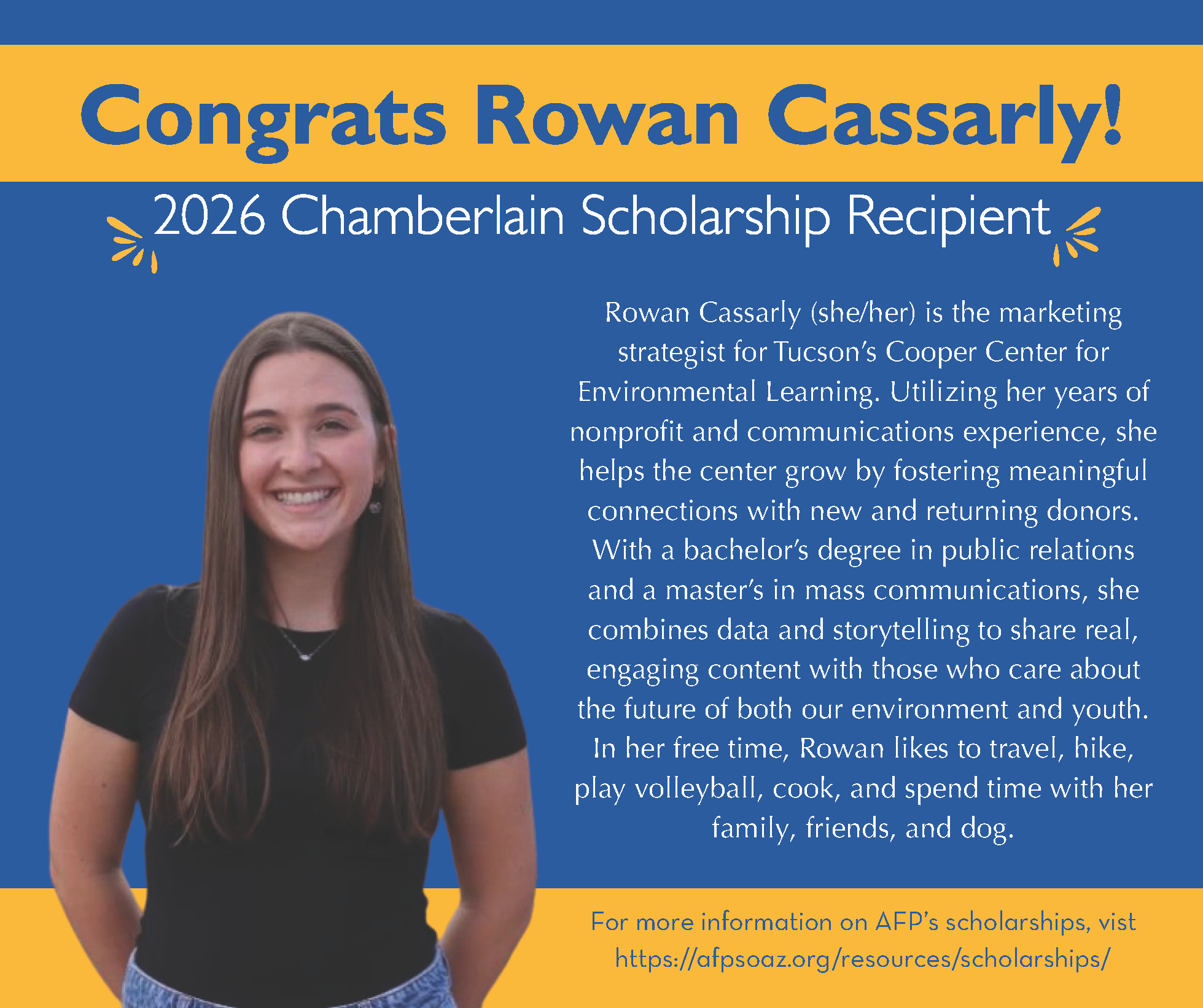 - Chamberlain Scholarship (only 1 available) – Covers the recipient’s conference registration to AFP ICON, the annual fundraising conference hosted by AFP. The scholarship is available to AFP Southern Arizona Chapter members who have never attended AFP ICON. Recipients must dedicate 50% or more of their work time to fundraising. Closed for 2026